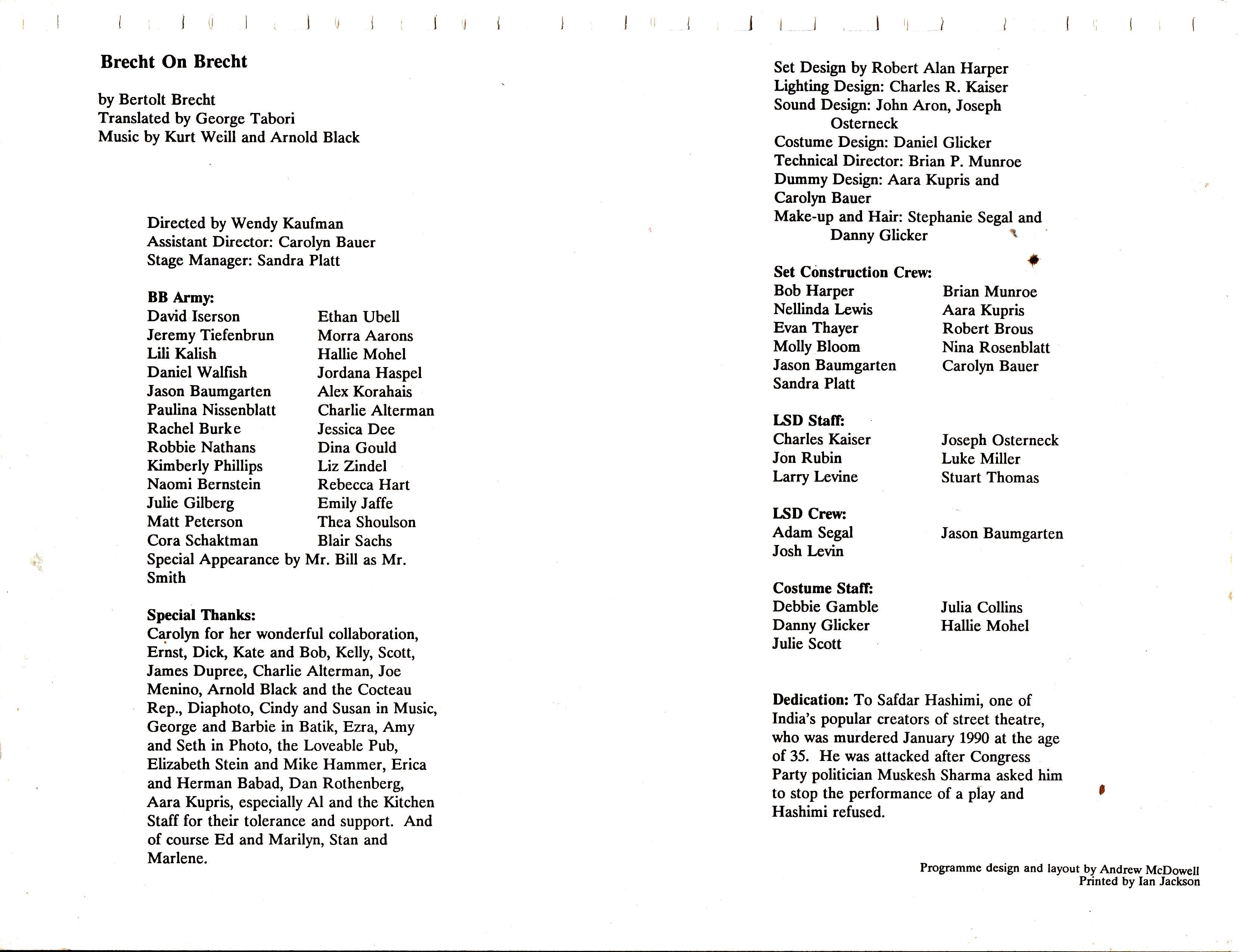 Dedication: to Safdar Hashimi, one of India's popular creators of street theatre, who was murdered January 1990 at the age of 35. He was attacked after Congress Party politician Muskesh Sharma asked him to stop the performance of a play and Hashimi refused.