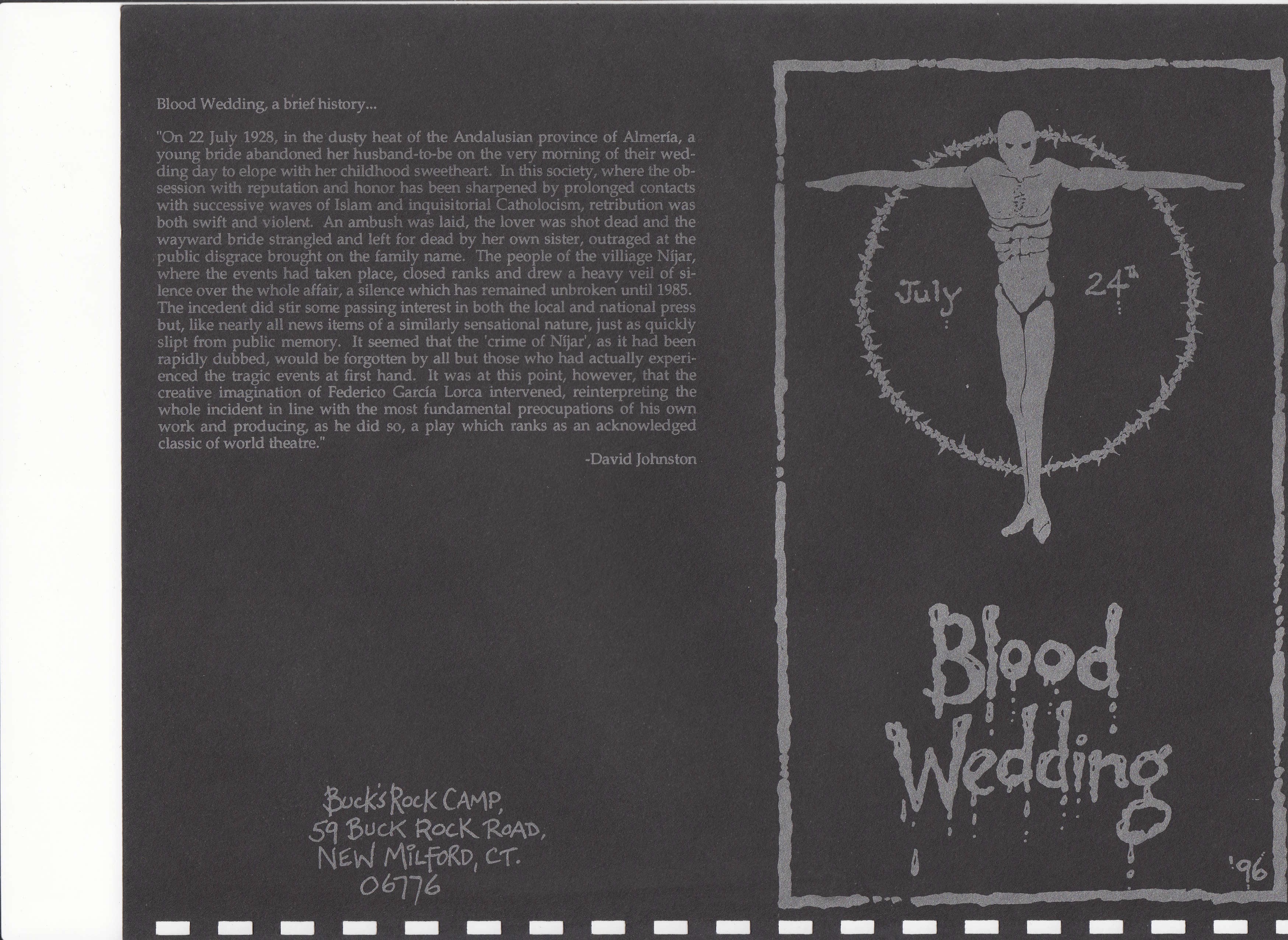 Federico García Lorca was fascinated by the many layers of human emotion and humanity's intrinsic connection with the natural forces that control our lives. Lorca's plays and poems are thick with metaphor and symbolism. We have tried to produce a piece of theatre that is both theatrically challenging and true to the spirit of the author. It is our hope that you will find this production both stimulating and entertaining.