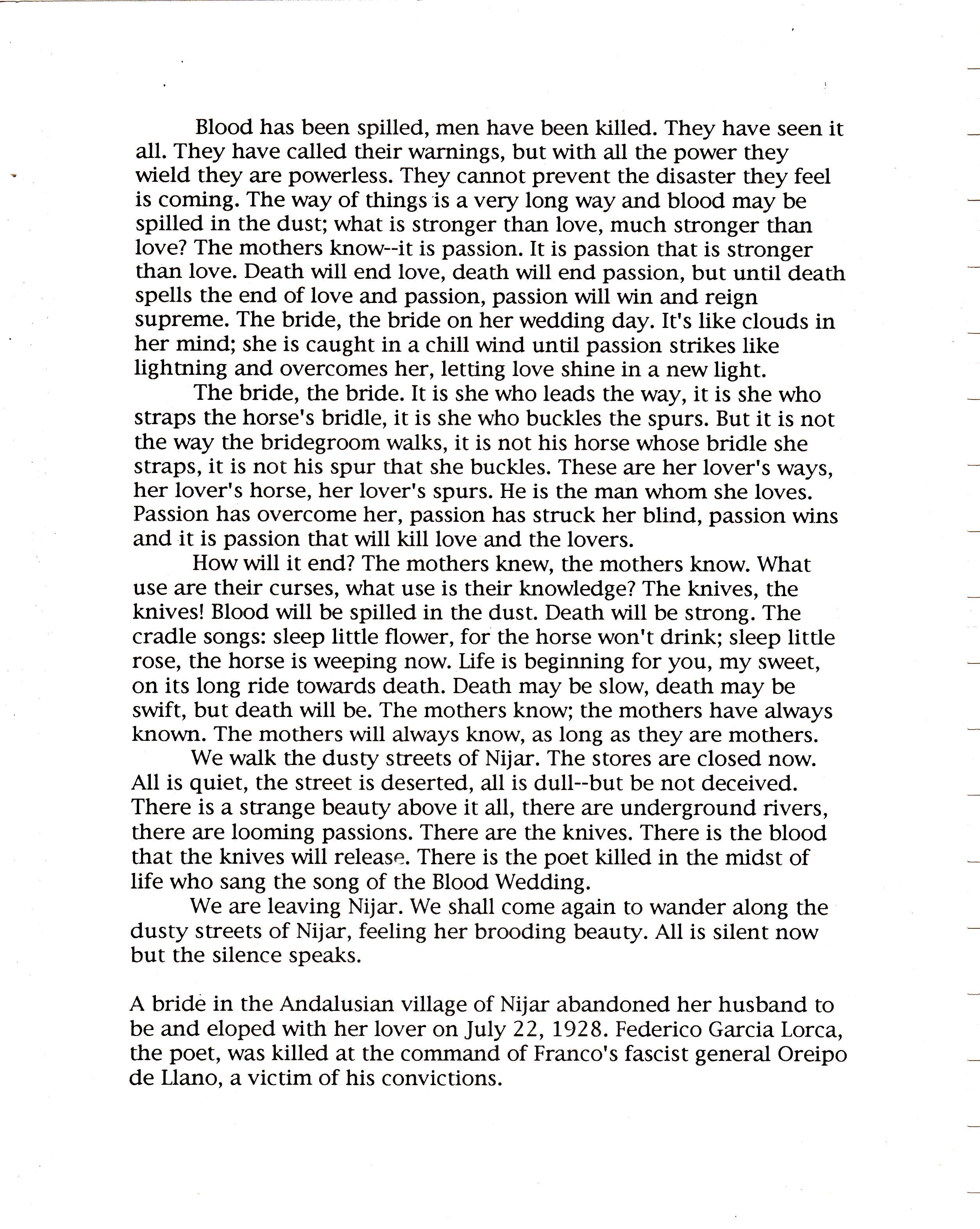 "On 22 July 1928, in the dusty head of the Andalusian province of Almería, a young bride abandoned her husband-to-be on the very morning of their wedding day to elope with her childhood sweetheart. In this society, where the obsession with reputation and honor has been sharpened by prolonged contacts with successive waves of Islam and inquisitorial Catholocism, retribution was both swift and violent. An ambush was laid, the lover was shot dead and the wayward bride strangled an left for dead by her own sister, outraged at the public disgrace brought on the family name. The people of the village Níjar, where the events had taken place, closed ranks and drew a heavy veil of silence over the whole affair, a silence which has remained unbroken until 1985. The incident did stir some passing interest in both the local and national press but, like nearly all new items of a similarly sensational nature, just as quickly slipt from public memory. It seemed that the 'crime of Níjar', as it had been rapidly dubbed, would be forgotten by all but those who had actually experienced the tragic events at first hand. It was at this point, however, that the creative imagination of Federico García Lorca intervened, reinterpreting the whole incident in line with the most fundamental preoccupations of his owk work and producing, as he did so, a play which ranks as an acknoelwdged classic of world theatre."
