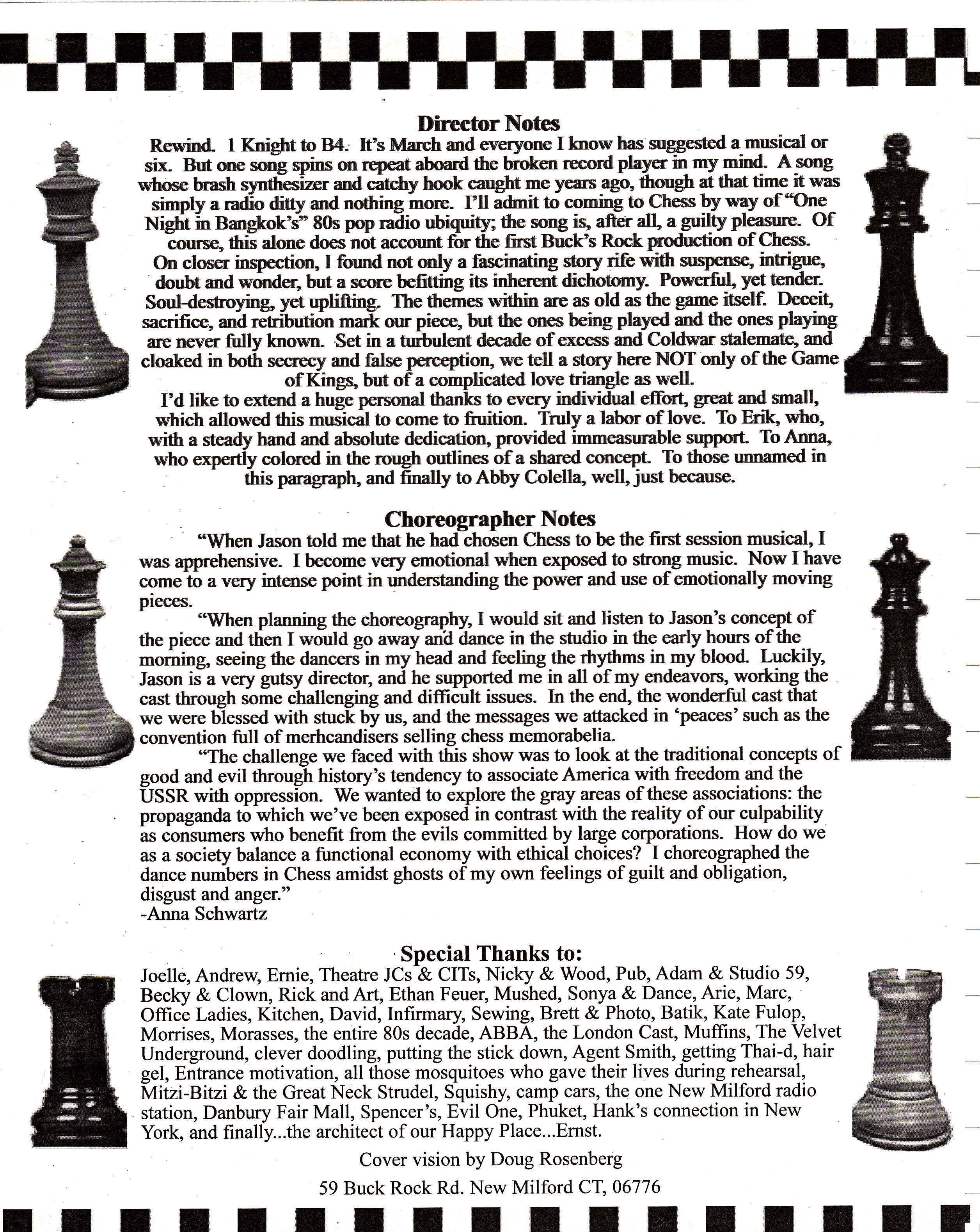 Rewind. I Knight to B4. It's March and everyone I know has suggested a musical or six. But one song spins on repeat aboard the broken record player in my mind. A song whose brash synthesizer and catchy hook caught me years ago, though at that time it was simply a radio ditty and nothing more. I'll admit to coming to Chess by way of One Night in Bangkok's" 80s pop radio ubiquity; the song is, after all, a guilty pleasure. Of course, this alone does not account for the first Buck's Rock production of Chess.