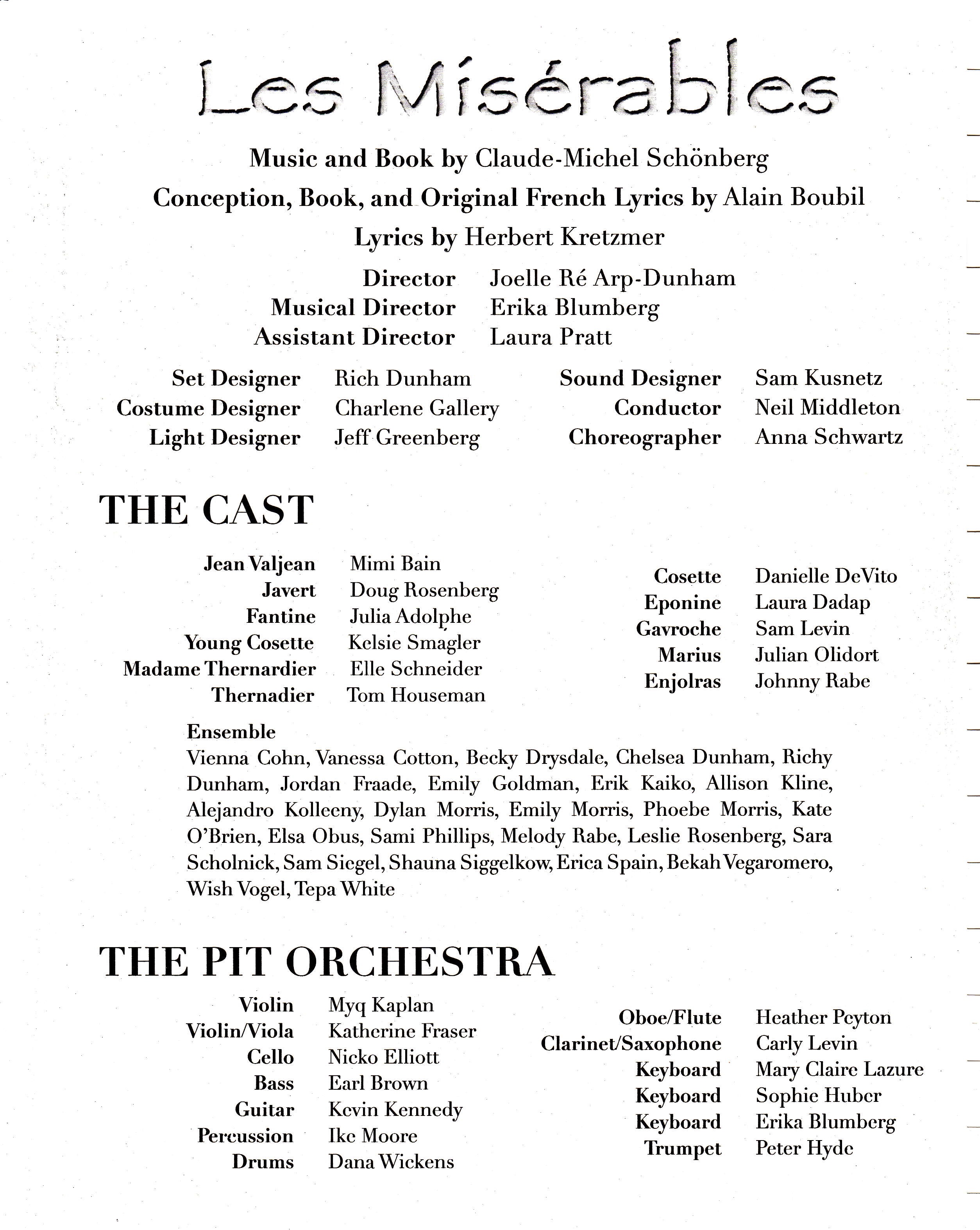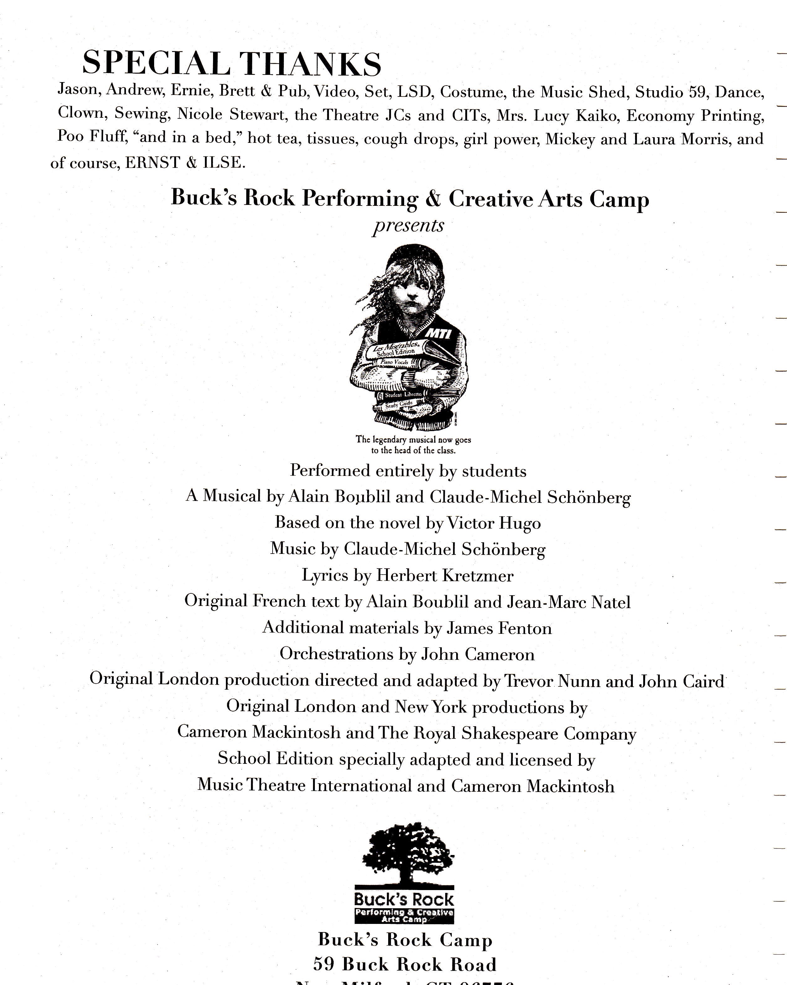 "The Miserables," who'd want to see a show about them? Since its London opening in 1985, Les Misérables has been performed for millions of people in 30 different countries. Obviously these are not just miserable people on stage complaining. The characters in Les Misérables have a hope despite their squalid conditions. The poor and destitute challenge us to help them; the students give their lives in an attempt to better the world; Valjean and Marius learn how to forgive and the play's truth- "to love another person is to see the face of God." Les Misérables never pretends the world is perfect; there will always be vultures like the Thenardiers around. Despite this we are convinced that "even the darkest night will end and the sun will rise." I hope each of our campers take these ideals with them as they leave Buck's Rock and return to "the real world." Join us in our quest for the dawning of a new day.