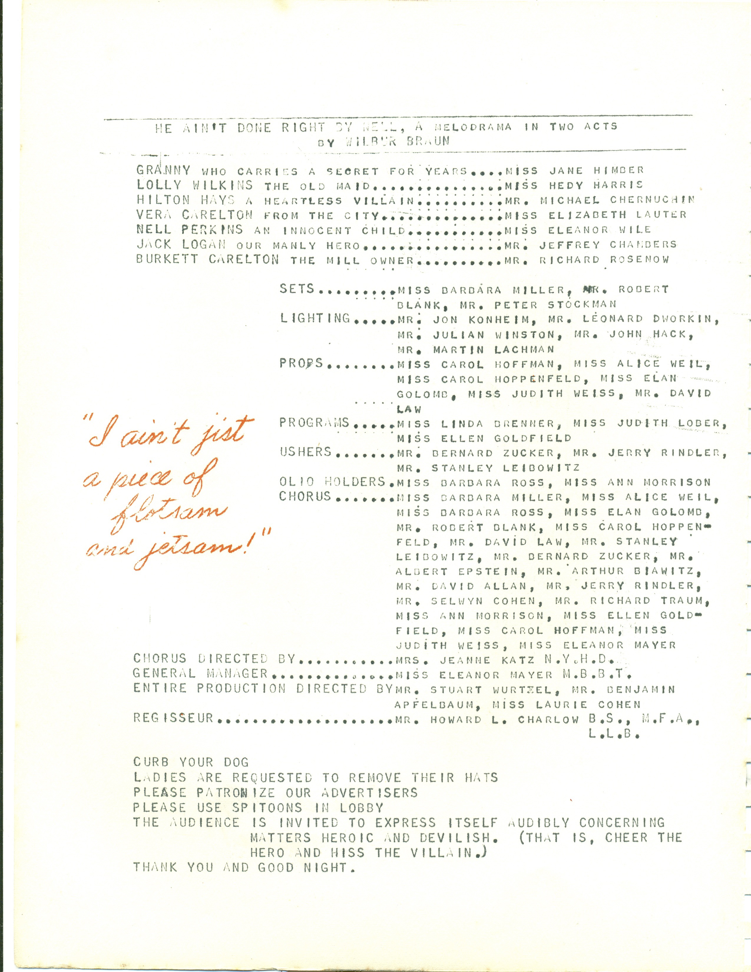 Date approximate. From the program: "Curb your dog. Ladies are requested to remove their hats. Please patronize our advertisers. Please use spitoons [sic] in lobby. The audience is invited to express itself audibly concerning matters heroic and devilish. (That is, cheer the hero and hiss the villain.) Thank you and good night."