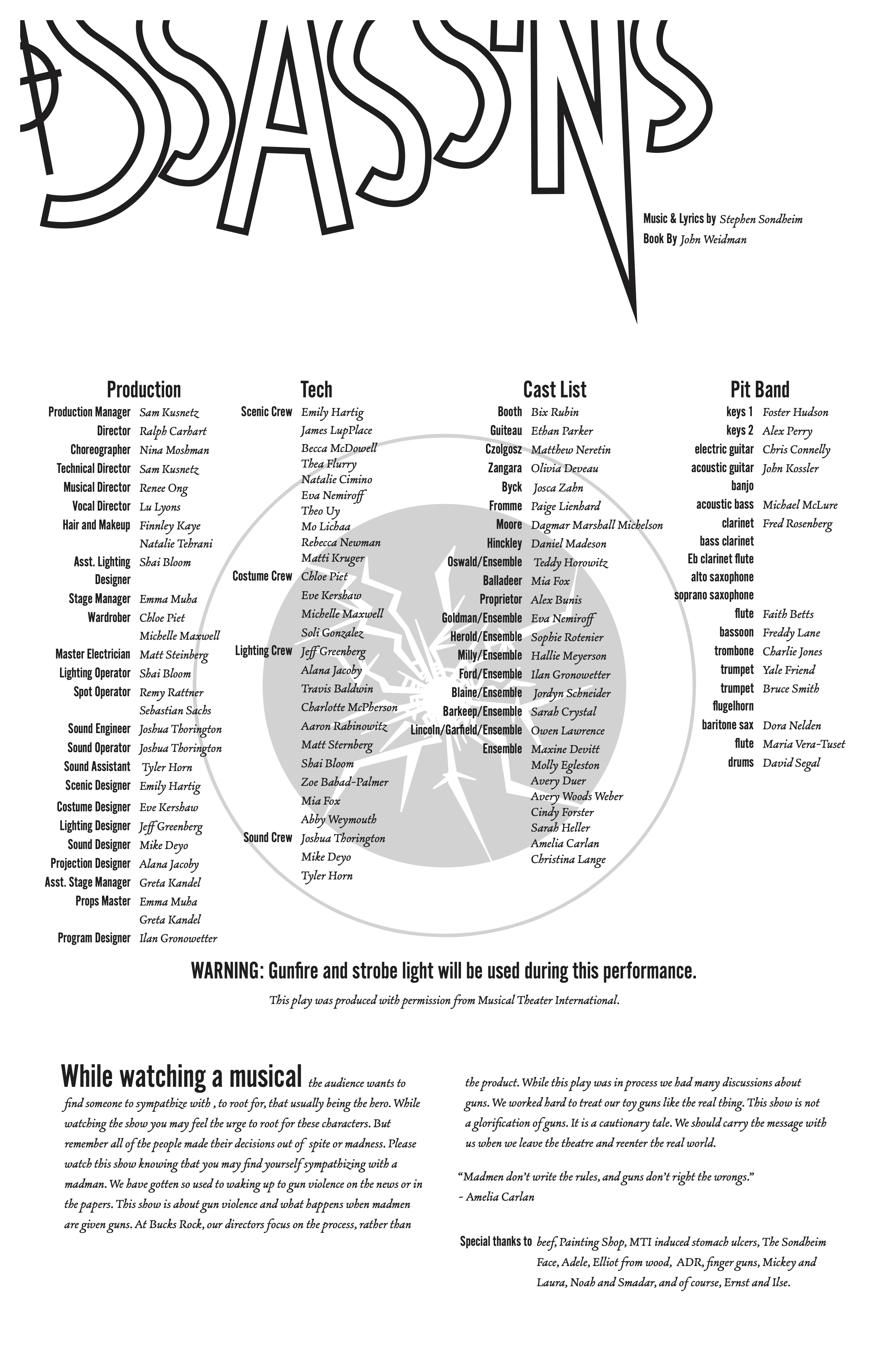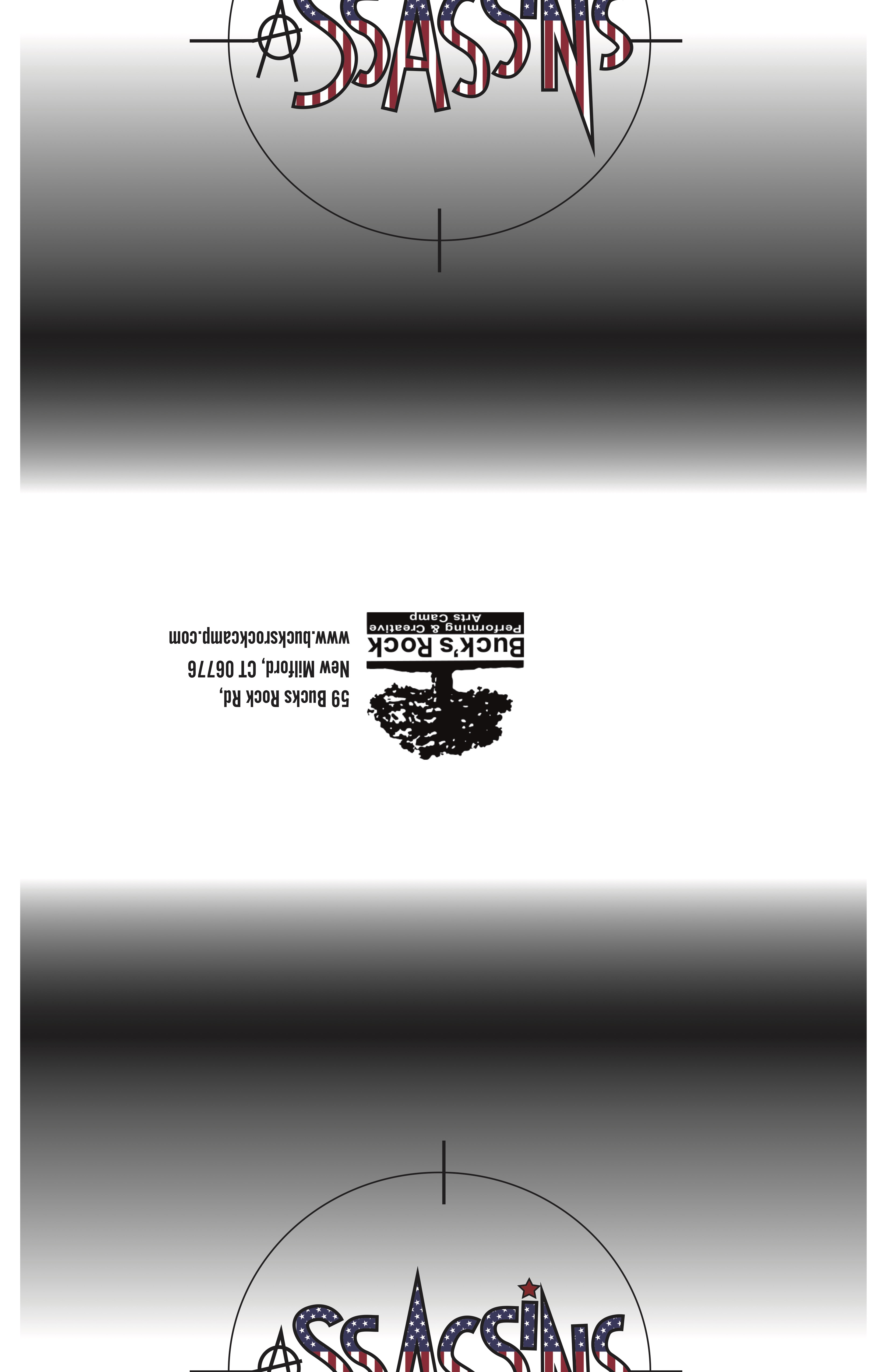 While watching a musical the audience wants to find someone to sympathize with, to root for, that usually being the hero. While watching the show you may feel the urge to root for these characters. But remember all of the people made their decisions out of spite or madness. Please watch this show knowing that you may find yourself sympathizing with a madman. We have gotten so used to waking up to gun violence on the news or in the papers. This show is about gun violence and what happens when madmen are given guns. At Buck's Rock, our directors focus on the process, rather than he product. While this play was in process we had many discussions about guns. We worked hard to treat our toy guns like the real thing. This show is not a glorification of guns. It is a cautionary tale. We should carry the message with us when we leave the theatre and reenter the real world.