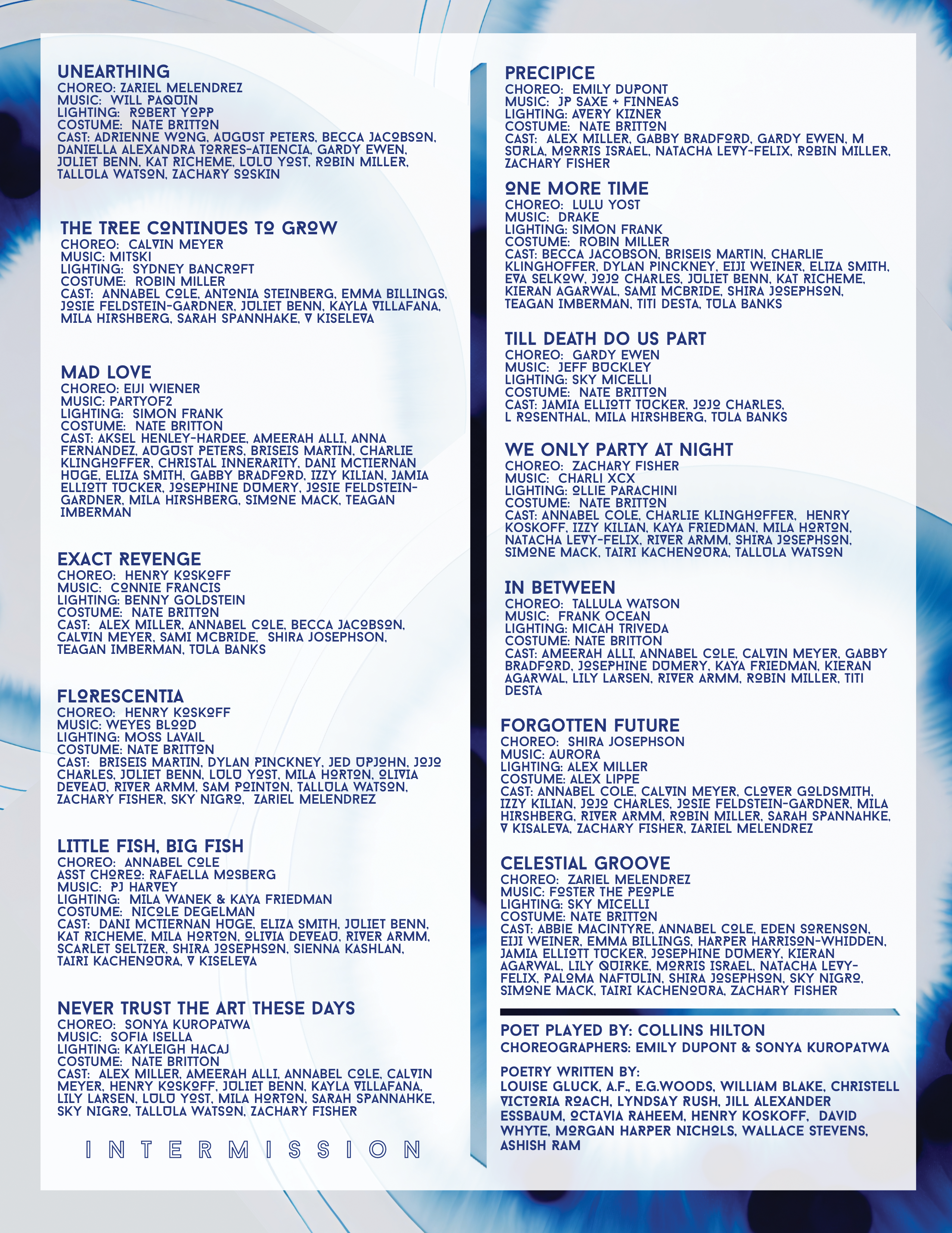 Poetry written by Louise Gluck, A.F., E.G. Woods, William Blake, Christell Victoria Roach, Lyndsay Rush, Jill Alexander Essbaum, Octavia Raheem, Henry Koskoff, David Whyte, Morgan Harper Nichold, Wallace Stevens, and Ashish Ram.