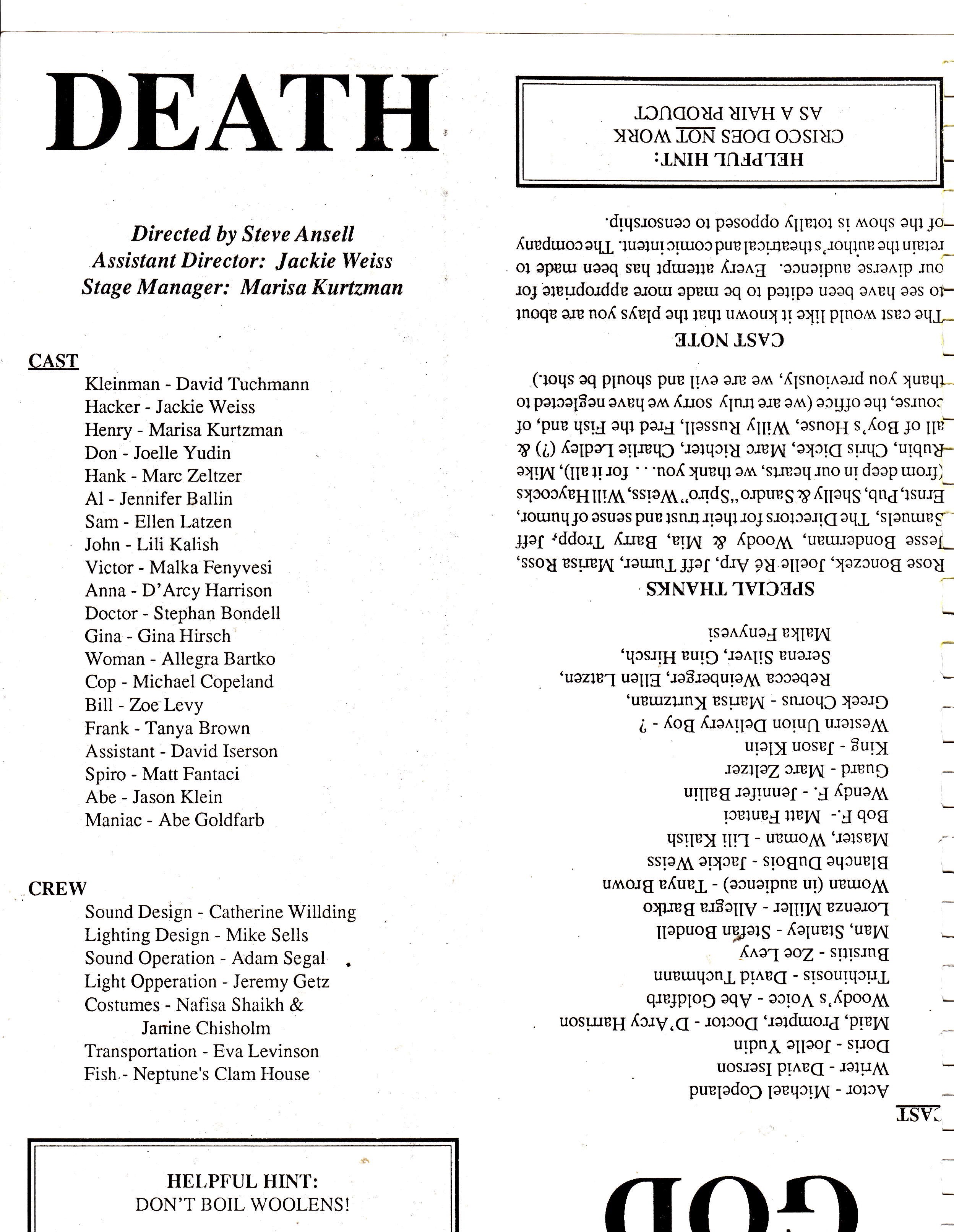 Cast Note: The cast would like it known that the plays you are about to see have been edited to be made more appropriate for our diverse audience. Every attempt have been made to retain the author's theatrical and comic intent. The company of the show is totally opposed to censorship.