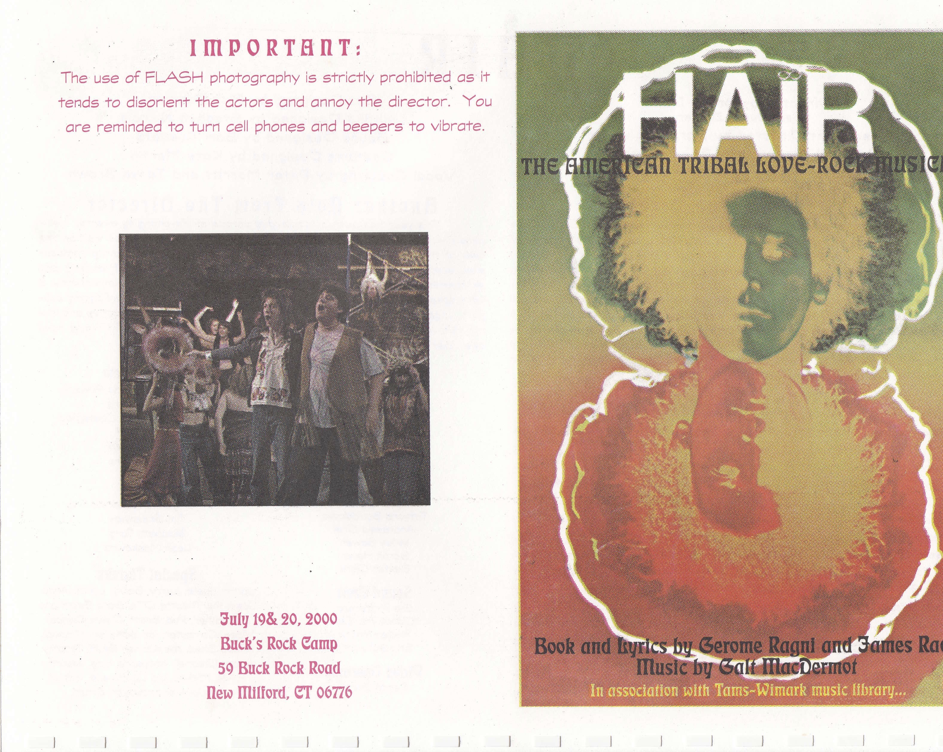 At the risk of sounding excessively politically correct, we at Buck's Rock [deem?] it necessary to comment on the multiple drug references in our production of HAIR. The camp chose HAIR as a celebration of a time, places in our history, and indeed our lives. The play was not written, nor was it selected now, to affirm or otherwise approve drug use. Rather, its purpose was to celebrate the spirit of a time where in all of our adolescent fervor we pursued to question, to know, and to experiment at all levels; all in the hope of gathering a clue about who we were and where we were going, and hopefully gaining some new level of awareness in the process. When you watch the Buck's Rock production of HAIR, try to remember the context in which it was originally created: a time where life for many of us was a giant cosmic "what if?" Enjoy. Peace.