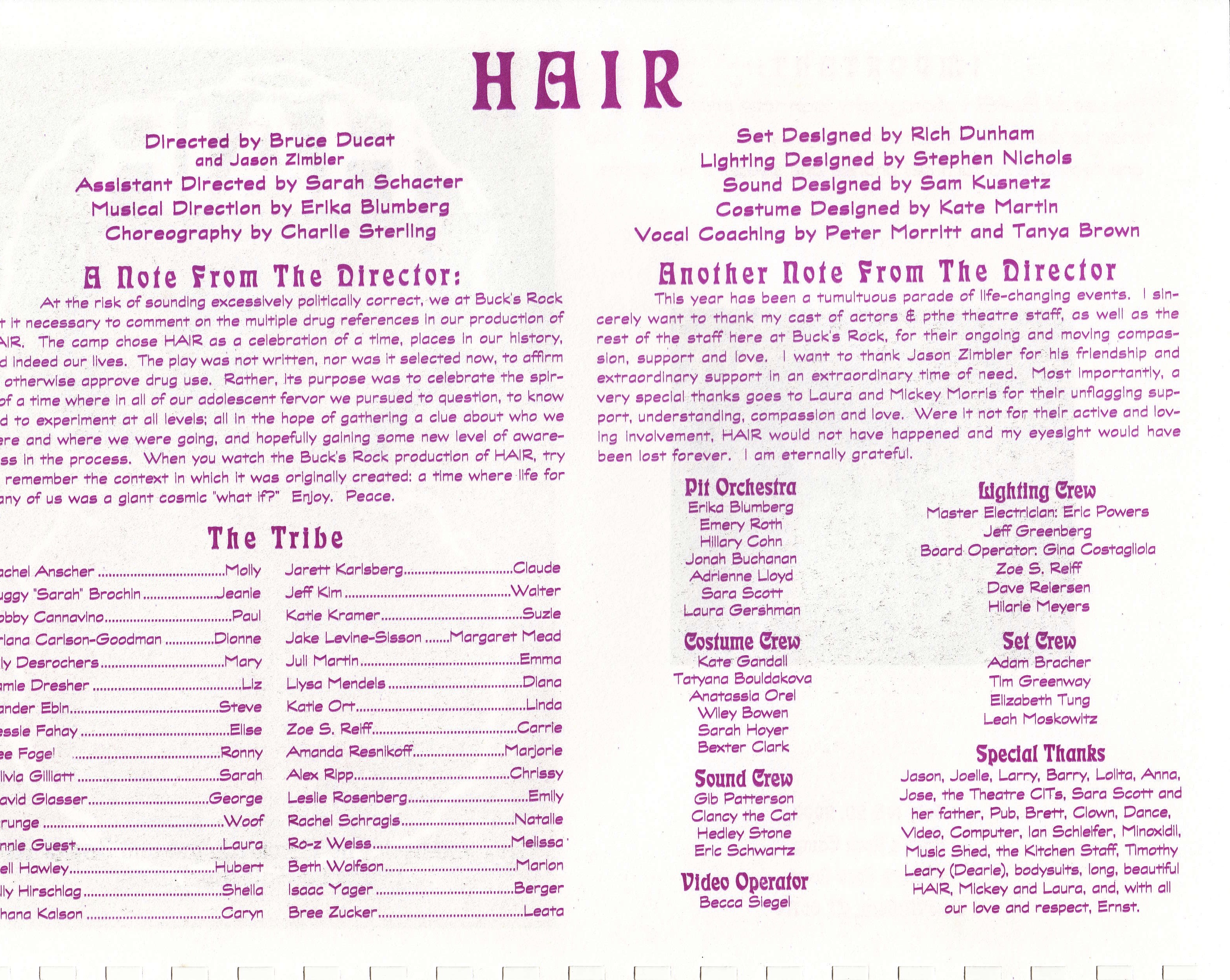 This year has been a tumultuous parade of life-changing events. I sincerely want to thank my cast of actors & the theatre staff, as well as the rest of the staff here at Buck's Rock, for their ongoing ona moving compassion, support and love. I want to thank Jason Zimbler for his friendship and extraordinary support in an extraordinary time of need. Most importantly, a very special thanks goes to Laura and Mickey Morris for their unflagging support, understanding, compassion and love. Were it not for their active and loving involvement, HAIR would not have happened and my eyesight would have been lost forever. I am eternally grateful.