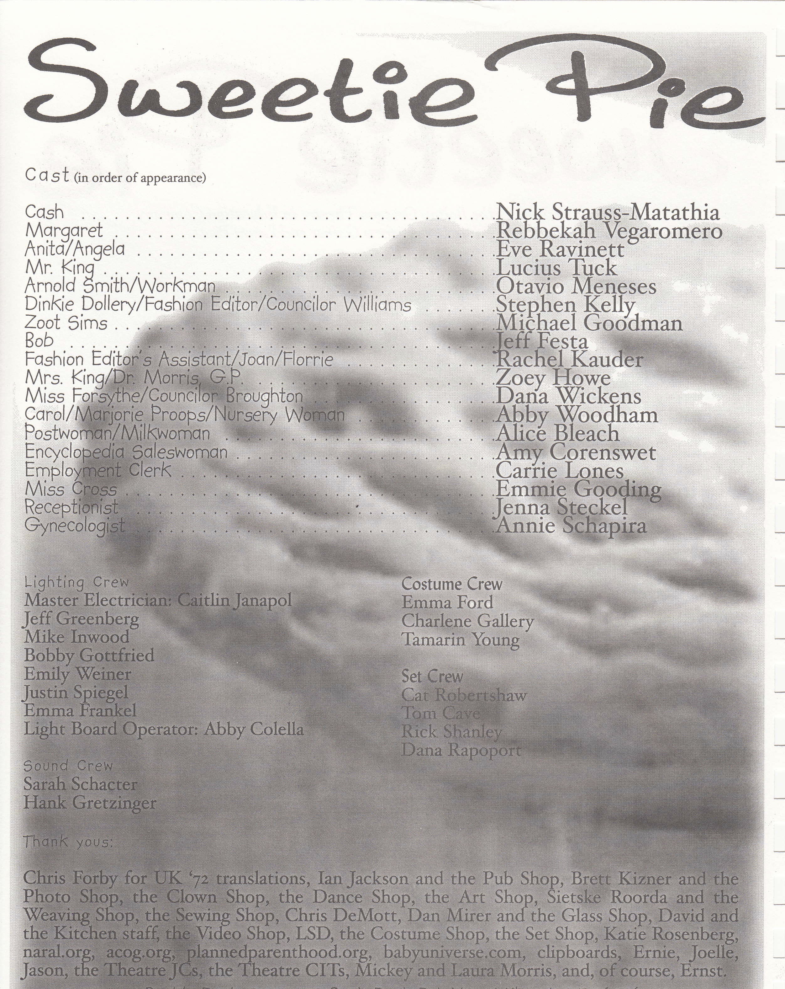 | Lighting Designer | Gayle Shanley | Credited as "Gayle MacDonald." |